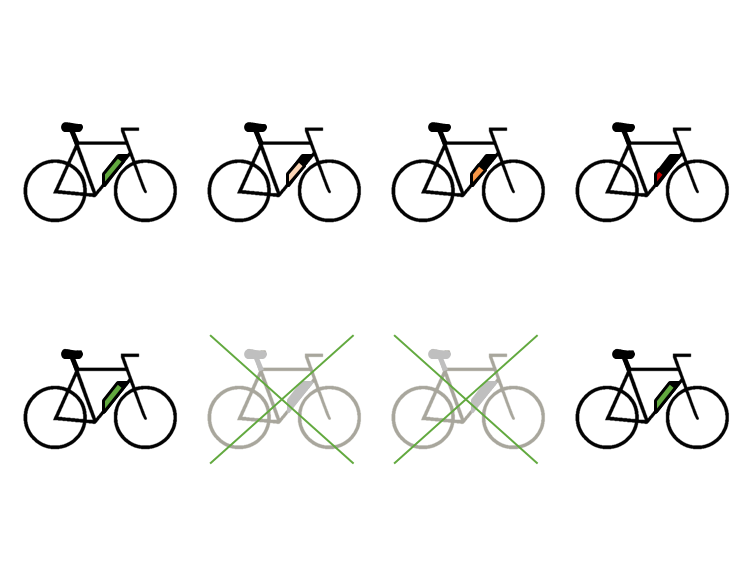 - !!! Vyhněte se neznačkovým bateriím nebo repasovaným bateriím od pochybných dodavatelů (bez dokladu, bez jasného původu, bez záruky = škody na vašem elektrokole mohou být fatální).